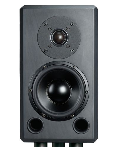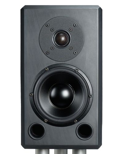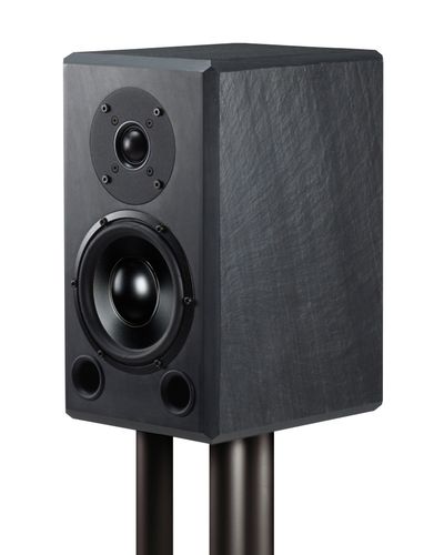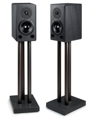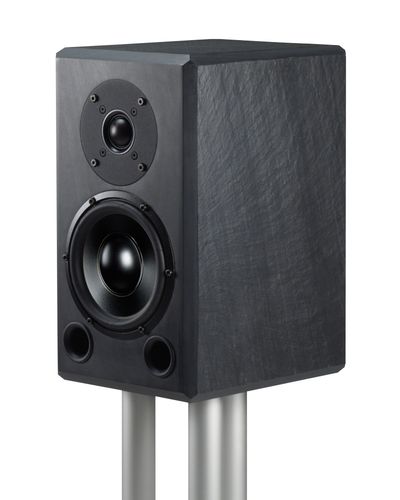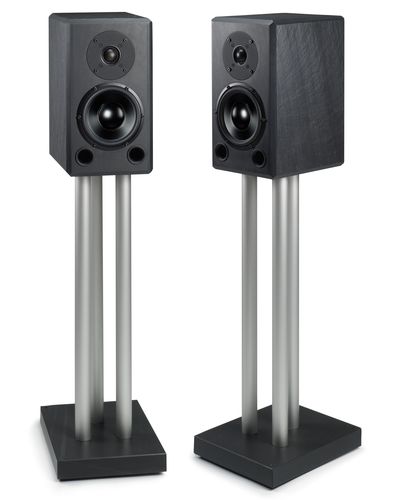 Speaker stand: black or silver anodized, sand filled aluminium tube (hight: 690 mm incl. floor plate, weight: 11 kg) with massive slate floor plate (234 mm x 300 mm x 40 mm), adjustable.